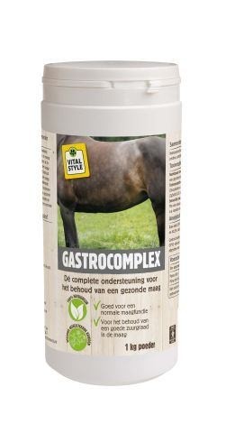 Vitalstyle GastroComplex 1kg voor een gezonde maagfunctie GASTROCOMPLEX Complete ondersteuning voor het behoud van een gezonde maag GOED VOOR EEN NORMALE MAAGFUNCTIE VOOR HET BEHOUD VAN EEN GOEDE ZUURGRAAD IN DE MAAG DRAAGT BIJ AAN EEN ONTSPANNEN MAAG DÉ COMPLETE ONDERSTEUNING VOOR HET BEHOUD VAN EEN GEZONDE MAAG GastroComplex is speciaal ontwikkeld ter ondersteuning van een normale zuurgraad in de maag bij paarden en pony's. Het ondersteunt tegen de invloeden van stress, is vriendelijk voor de maag en bevat buffers voor het behoud van een normale zuurgraad in de maag. Het bevat een complex aan bufferende en rustgevende ingrediënten. GastroComplex is dé complete en natuurlijke ondersteuning voor een normale maagfunctie bij paarden. WANNEER GASTROCOMPLEX? Is jouw paard onrustig op stal of boos bij het aansingelen en poetsen? Of heb je een paard dat gevoelig is voor stress? Dan kan de ondersteuning van GastroComplex fijn zijn! Kijk ook goed naar het complete management en rantsoen van je paard. Voorbeelden van gedragingen waarbij GastroComplex geadviseerd wordt: Boos bij aansingelen Luchtzuigen Kribbebijten Onrustig op stal Nukkig Minder werklust HOE ONTSTAAT EEN GEVOELIGE MAAG BIJ PAARDEN? De maag van een paard produceert constant maagzuur als hulp bij het verteren van voedsel. Speeksel zorgt ervoor dat het zure maagsap wordt geneutraliseerd. Alleen door te kauwen maakt een paard speeksel aan. Als de maag lang leeg is of er weinig speeksel wordt aangemaakt, kan het maagzuur de maagwand aantasten wat erg pijnlijk is. Ook stress heeft invloed op de maag. Stress zorgt voor een verminderde bloedtoevoer naar de maagwand, waardoor deze nog gevoeliger wordt voor maagzuur. Het is dus belangrijk om stress te voorkomen en dat paarden de hele dag kleine beetjes kunnen eten, zodat voldoende speeksel wordt aangemaakt. Lees meer in het blog ''Paard met een gevoelige maag?'' TIP VAN VITALSTYLE Combineer GastroComplex met de Gut & Gastro muesli! Dé structuurrijke, natuurlijke en graanvrije muesli voor een normale maag- en darmfunctie. SAMENSTELLING Natriumbicarbonaat, magnesiumoxide, pectine, spirulina, calciumcarbonaat. TOEVOEGINGSMIDDELEN PER KG Nutritionele toevoegingsmiddelen: Zinkchelaat van glycinehydraat (3b607) 1.125 mg Technologische toevoegingsmiddelen: Clinoptiloliet van sedimentaire oorsprong (1g568) 200.165 mg Sensoriële toevoegingsmiddelen: Mix van natuurlijke aromatische extracten: o.a. kamille en heemstwortel. Analytische bestanddelen: Ruw eiwit 2,5%, ruwe celstof 1,7%, ruw vet 0%, ruwe as 63,3%, natrium 13,2%, calcium 0,47%, fosfor 0%. GastroComplex is een natuurlijk, graan-, gluten-, soja- en GMO-vrij recept met toegevoegde mineralen. Het bevat geen toegevoegde suikers. WAT ZIT ER IN GASTROCOMPLEX? Natriumbicarbonaat: Buffer voor normale zuurgraad in de maag. Magnesiumoxide: Buffer voor normale zuurgraad in de maag. Pectine: Draagt bij aan een gezond maagslijmvlies. Spirulina: Is rijk aan antioxidanten en ondersteunt het maagslijmvlies. Calciumcarbonaat: Ondersteunt de ontspanning van de maag. Kamille: Draagt bij aan een ontspannen spijsvertering. Heemstwortel: Bevat maagvriendelijke slijmstoffen. VOEDINGADVIES Een afgestreken maatschepje bevat 15 g. Voeradvies per dag Paard 450-600 kg 30 gram Pony tot 450 kg 15 gram Mag ook bij drachtige merries gebruikt worden. Gebruiksduur: 30 g per dag = 33 dagen 15 g per dag = 66 dagen Lees meer...