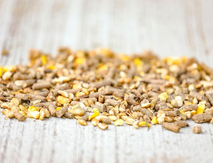 haver, tarwevoermeel, lijnzaaddoppen, gerstvlokken, geëxpandeerde gerst, geëxpandeerde maïs, tarwezemelen, tarweglutenvoer, bietenmelasse, zonnebloemzaadvoer, sojabonendoppen (geproduceerd met genetisch gemodificeerde soja), lijnzaad, sojabonen getoast, tarwe, speltzemelen, sojavezel, brouwersgist, tarwegries, calciumcarbonaat, maïsglutenvoer, fructo-oligosachariden, sojavoer (geproduceerd met genetisch gemodificeerde soja), natriumchloride, sojaolie, maïs, brisuren van oliehoudende zaden