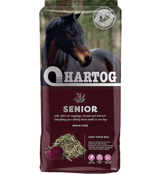 De Hartog Senior is speciaal ontwikkeld voor paarden met specifieke voedingsbehoeften zoals senioren, paarden met verminderd kauwvermogen en revaliderende paarden. De Hartog Senior is een zeer smakelijke en zachte ruwvoermix dat (wanneer compleet gevoerd) zowel het ruw- als krachtvoer kan vervangen. Bovendien heeft de Hartog Senior een laag suiker- en zetmeel gehalte en is het vrij van graan en melasse.