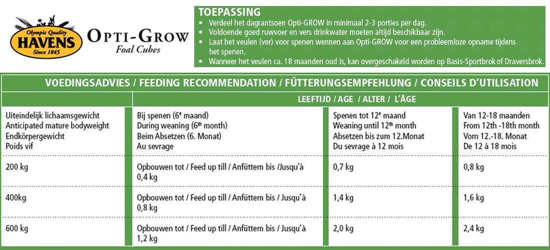 Na ca. 18 maanden adviseren wij om de OptiGROW te vervangen voor bijvoorbeeld de DraversBrok. De behoefte van een jong paard (na de 18 maanden) komt sterk overeen met de behoefte van een sportpaard en vandaar dat wij in veel gevallen als opvolger onze DraversBrok adviseren.