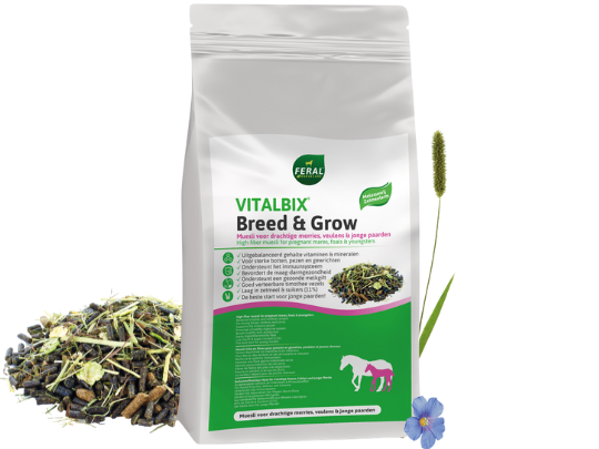 Vitalbix Breed & Grow is een unieke, vezelrijke muesli samengesteld volgens de laatste inzichten op het gebied van voeding voor drachtige merries, veulens, jonge paarden (tot ca. 3 jaar) en dekhengsten. Breed & Grow is rijk aan vezels, laag in zetmeel & suikers en bevat een uitgebalanceerd gehalte goed opneembare vitaminen, mineralen en sporenelementen. Breed & Grow levert gezonde energie uit vezels en vetten, ondersteunt een gezonde maag-darmfunctie en houdt drachtige en lacterende merries in goede conditie. Vitalbix Breed & Grow ondersteunt een gezonde groei van het veulen en de ontwikkeling van sterke botten, pezen en gewrichten.