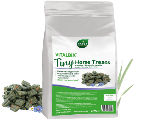 Vitalbix Tiny Treats zijn kleine beloningsbrokjes boordevol gezonde ingrediënten zoals timothee, lijnzaad, bietenpulp, wortel en kamille. Ideaal als beloning bij grondwerk, vrijheidsdressuur en clickertraining, of gewoon om je paard te verwennen … Bevat geen melasse, granen, soja en lucerne. Laag in zetmeel & suiker.