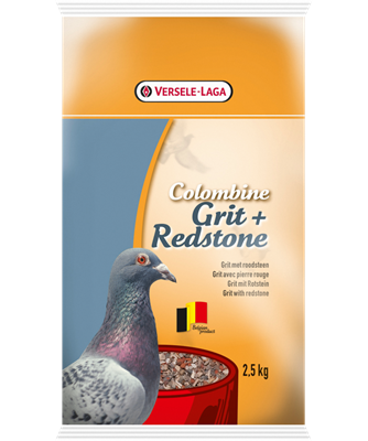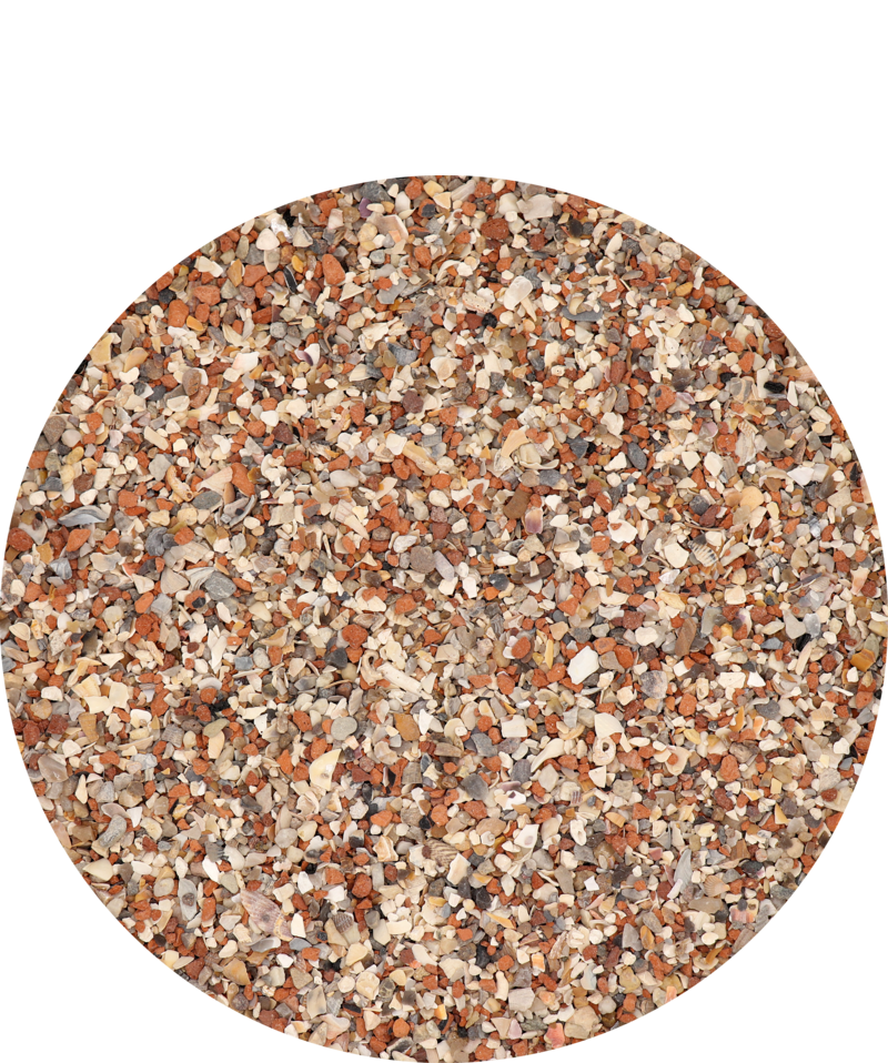 Colombine Grit + Redstone bevat maagkiezel, silexsteentjes, oesterschelpen, zeeschelpen, roodsteen en houtskool.