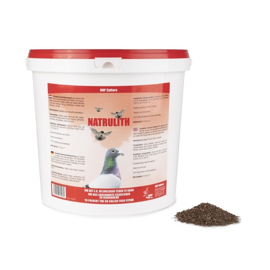 DHP Cultura Natrulith duivenmineralen (alternatief voor Beaphar Vitalith) emmer 12.5kg Mineralenmengsel waar duiven het hele jaar door behoefte aan hebben. De ingrediënten van Natrulith worden veel al door duiven gezocht op het veld waardoor het z.g. veldvliegen ontstaat met alle risico’s van dien. Samenstelling: Scherpe kiezel, gemengd grit, oestergrit, koolstof houdend kleimineraal, sojaolie, natriumbicarbonaat, onkruidzaden, natriumchloride. Gebruiksaanwijzing: Dagelijks naar behoefte verstrekken. Aanvullend diervoeder voor duiven. Droog en koel bewaren Lees meer...