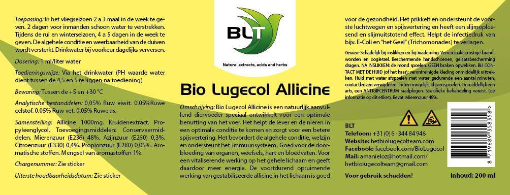 Bio Lugecol Allicine (200 ml) is een natuurlijk aanvullend diervoeder speciaal ontwikkelt voor een optimale benutting van het voer.