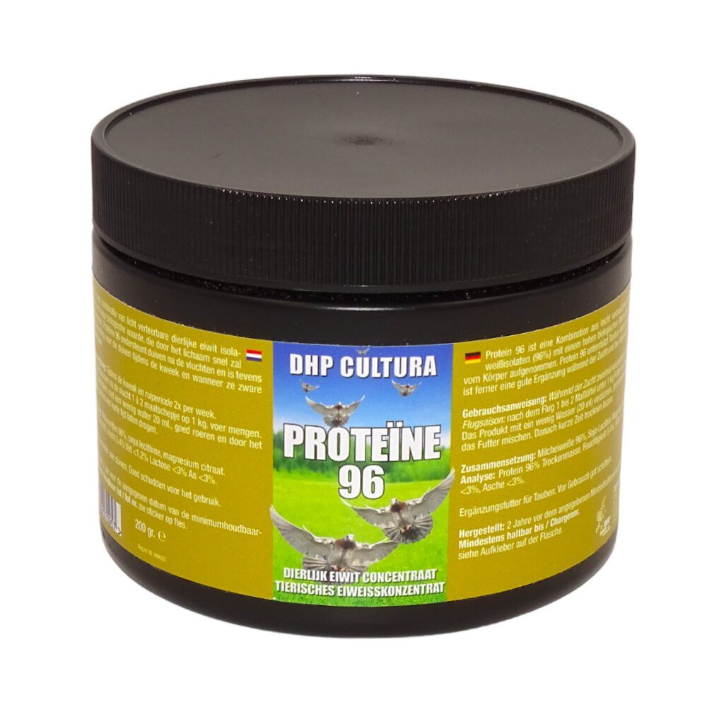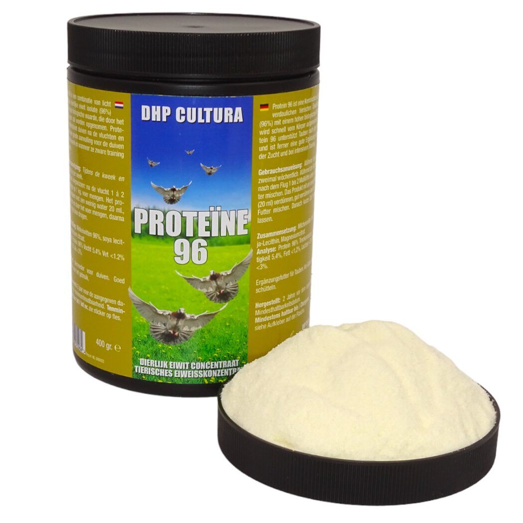 Protëine 96 is een uniek vorm van eiwitconcentraat voor een snelle recuperatie na de vluchten, welke gemakkelijk door de duiven wordt opgenomen.