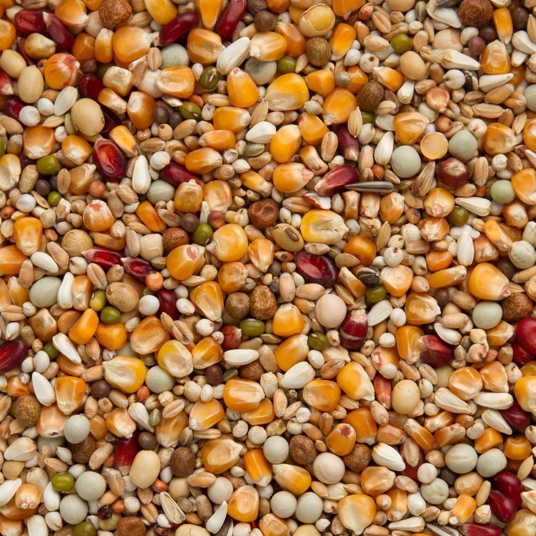 Tarwe 11%, bordeaux maïs 10%, cribbs maïs 10%, dari 10%, merano maïs 10%, plata maïs 10%, cardy 8%, groene erwten 4%, maple peas 4%, getoaste soja 3%, gele erwten 2%, gepelde haver 2%, gestreepte zonnebloempitten 2%, katjang idjoe 2%, kempzaad 2%, paddy rijst 2%, rode sorgho 2%vitsen 1,5%, witte millet 1,5%, gele millet 1%, koolzaad 1%, linzen 1%