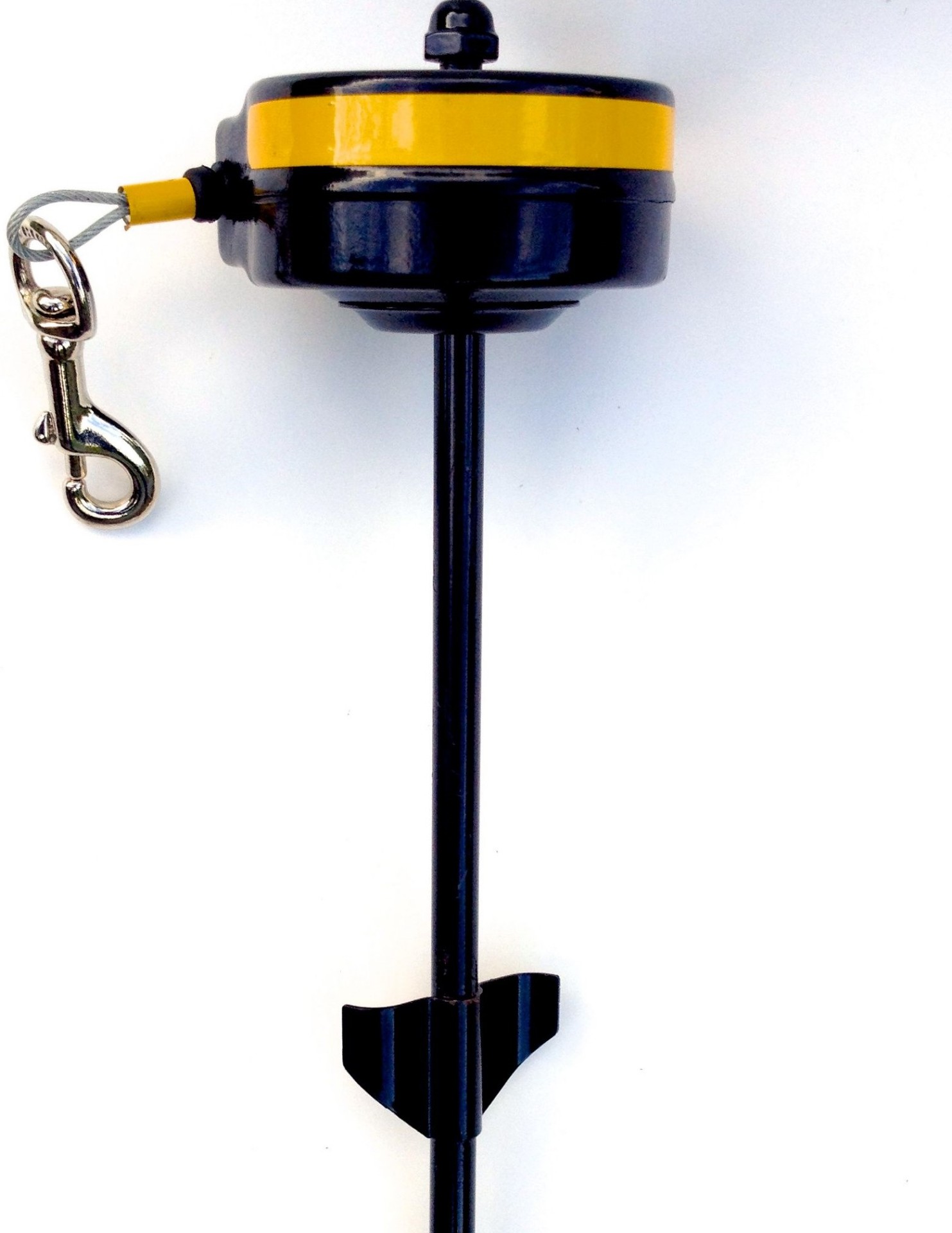 Zware metalen bodempin, 360° roterend met oprolbare staalkabel Ideaal om je hond vast te zetten en hem toch genoeg bewegingsvrijheid te geven. Soepel lopende kabel trekt strak maar blijft comfortabel voor de hond! Voorkomt dat de hond zich verstrikt in de lijn. Makkelijk in de grond vast te zetten dmv bijgeleverd hulpstuk Kabel verdwijnt geheel in de unit. Goed zichtbaar door reflecterende rand. Ideaal voor gebruik op camping, in de tuin of op reis Lees meer...