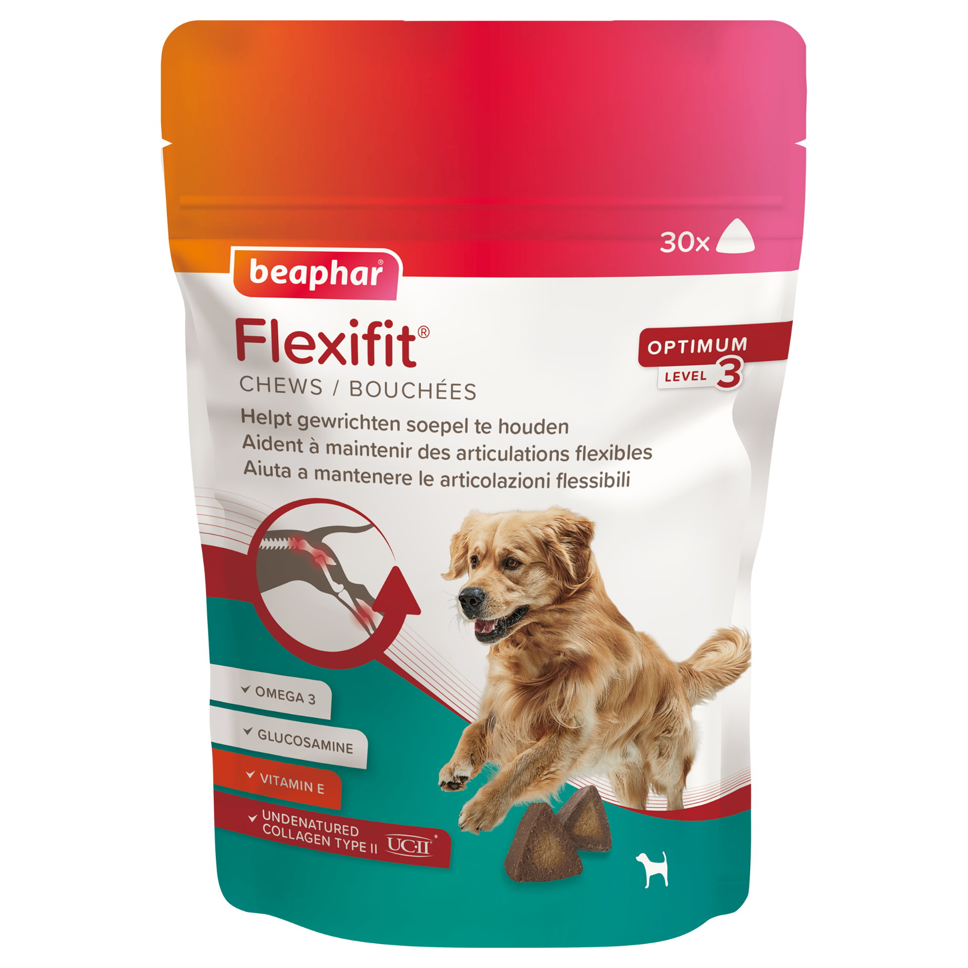 Beaphar Flexifit® Chews is een aanvullend dieetvoer voor honden ter ondersteuning van het metabolisme van de gewrichten in geval van osteoarthritis. Naast waardevolle omega 3-vetzuren en vitamine E, bevat Beaphar Flexifit® Chews ongedenatureerd collageen type II (40 mg UC-II® / brokje). Dit helpt bij de ondersteuning van pijnlijke gewrichten. Ook ondersteunt het zachte kauwbrokje het behoud van sterke botten en draagt het bij aan soepele gewrichten, wat honden helpt soepel te bewegen en een actief leven te leiden. Beaphar Flexifit® Chews wordt aanbevolen voor honden die extra ondersteuning van de gewrichten nodig hebben. Daarnaast is het een waardevolle aanvulling voor opgroeiende, oudere, actieve en sport- & werkhonden.
