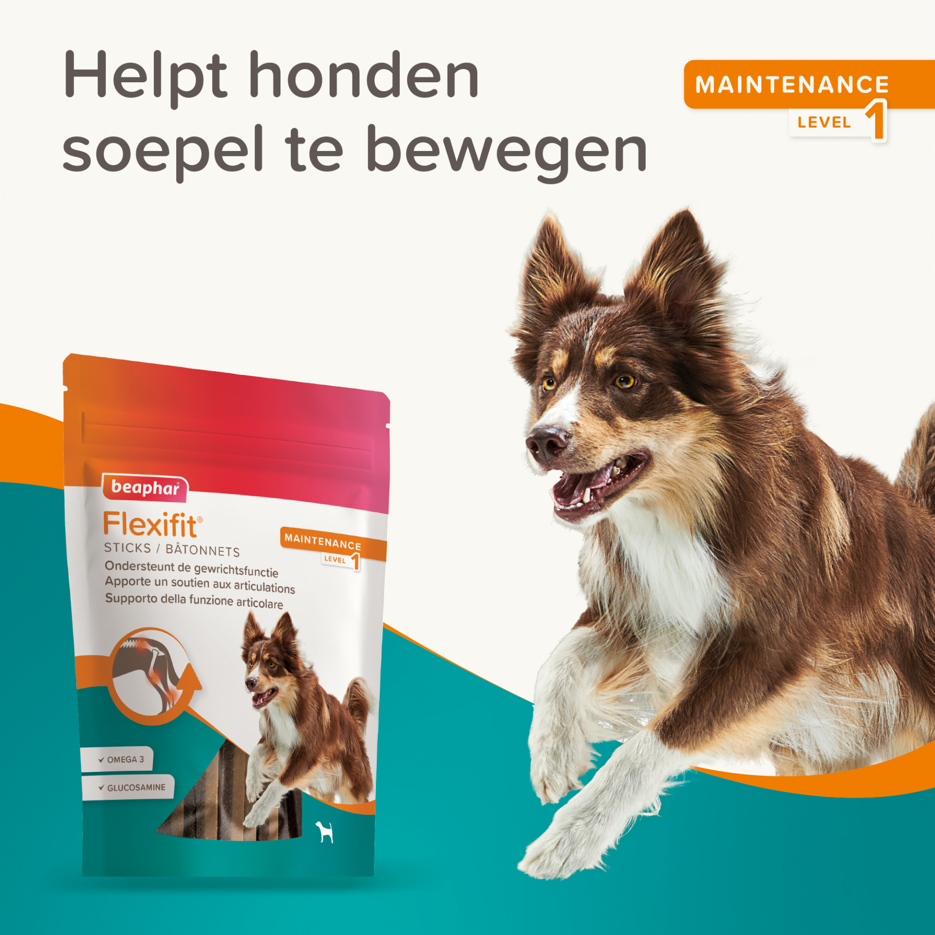 Beaphar Flexifit® Sticks is een heerlijke snack met vleessmaak die de gewrichtsfunctie ondersteunt. De multi-action formule met o.a. glucosamine, omega 3, groenlipmossel en vitamine C, helpt soepele gewrichten te behouden en ondersteunt het behoud van sterke botten. Beaphar Flexifit® Sticks helpt honden soepel te bewegen en een actief leven te leiden. Beaphar Flexifit® Sticks wordt aanbevolen voor honden die extra ondersteuning van de gewrichten nodig hebben. Daarnaast is het een waardevolle aanvulling voor opgroeiende, oudere, actieve en werkhonden. Geschikt vanaf 12 weken leeftijd.