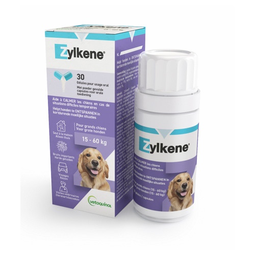 Zylkene is een natuurlijk voedingssupplement dat wordt gebruikt om honden en katten te ondersteunen in spannende tijden. Dit kan zijn wanneer ze aan een nieuwe omgeving of mensen moeten wennen, tijdens een verhuizing of vuurwerkangst. Zylkene bevat a-casozepine, dat afkomstig is uit melkeiwit (caseïne). Dit bestanddeel staat bekend om zijn rustgevende eigenschappen, vergelijkbaar met het effect van moedermelk op jonge dieren. Deze capsules dragen bij aan ontspanning, zonder dat jouw hond of kat hier slaperig van wordt. De capsules zijn eenvoudig in gebruik en kunnen rechtstreeks worden gegeven of geopend, waarbij het poeder over het voer wordt gestrooid. Zylkene is hypoallergeen, vrij van conserveermiddelen en lactosevrij. Het dient oraal te worden toegediend (aanvullend diervoeder). Zylkene bestaat uit een capsule met daarin een smaakvol, wateroplosbaar poeder. De capsule kan in haar geheel toegediend worden. Het verdient echter de voorkeur de capsule te openen en de inhoud te vermengen met het voer of tussendoortje. Indien nodig mag de Zylkene in een dubbele dosering gegeven worden. Zylkene is verkrijgbaar in 75, 225, en 450 mg in verpakkingen van 30 of 100 capsules. Zylkene is ook verkrijgbaar als smakelijke kauwbrokjes. Samenstelling Zylkene kat en kleine hond – 75 mg 77,3%: maltodextrine, caseïne (trypsine gehydroliseerd rundercaseïne), magnesiumstearaat. Capsule: 22,7%: runderhuidgelatine. Analytische bestanddelen Ruw eiwit 39%, vocht 8%, ruwe as 4%, ruw vet 2,5%, ruwe celstof 0%. Samenstelling Zylkene hond – 225 mg Zylkene poeder: 76,9%: caseïne (trypsine gehydroliseerd rundercaseïne), maltodextrine, magnesiumstearaat. Capsule: 23,1%: runderhuidgelatine. Analytische bestanddelen Ruw eiwit 75%, ruwe as 10,5%, vocht 8%, ruw vet 2%, ruwe celstof 0%. Samenstelling Zylkene hond - 450 mg Zylkene poeder: 82,9%: caseïne (trypsine gehydroliseerd rundercaseïne),magnesiumstearaat. Capsule: 17,1%: runderhuidgelatine. Analytische bestanddelen Ruw eiwit 78%, ruwe as 12%, vocht 8%, ruw vet 3%, ruwe celstof 0%. Lees meer...