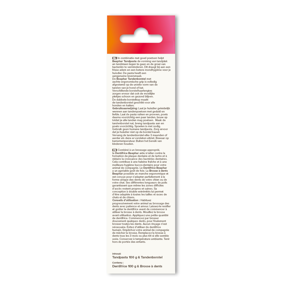 De Beaphar Tandenborstel biedt in combinatie met Beaphar Tandpasta (leversmaak) totale bescherming voor het gebit van jouw hond of kat. Dagelijks poetsen gaat tandplak en de vorming van tandsteen tegen en zorgt daarnaast voor een frisse adem. De pasta heeft een aangename leversmaak. De Beaphar Tandenborstel met zachte ergonomische grip is volledig afgestemd op de unieke vorm van de tanden van je hond of kat. Verschillende borstelhaarlengtes zorgen ervoor dat ook de moeilijke plekjes schoon en gezond blijven. De dubbele borstelkop maakt de tandenborstel geschikt voor alle honden en katten.