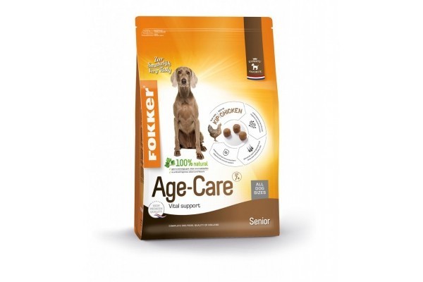 Fokker Age-Care is een high premium hondenvoeding, speciaal samengesteld voor de oudere hond (vanaf 7-9 jaar). De op deze levensfase afgestemde hoogwaardige ingrediënten, zorgen ervoor dat uw hond voortdurend fit en gezond blijft. Fokker Age-Care draagt bij aan het voorkomen van overgewicht en bevat (Noorse) zalmolie, wat een blijvend glanzende vacht ondersteunt. De toevoeging van chondroïtine en glucosamine draagt positief bij aan de bescherming van kraakbeen en gewrichten. Door de hoge smakelijkheid eet uw hond Fokker Age-Care met plezier.