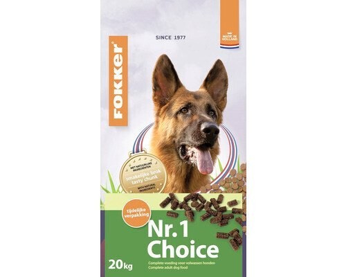 Fokker Dog NR.1 Choice inhoud 20kg Geperste hondenbrok Nr. 1 Choice Voeding voor volwassen honden. (Koud) geperste brok Fokker Nr. 1 Choice is een Fokker Nr. 1 Choice bevat hoog verteerbare, natuurlijke ingrediënten die uw hond fit en gezond houden. Dit product is een (koud) geperste brok. De afzonderlijke ingrediënten worden op lage temperatuur tot een brok geperst, waardoor de voedingswaarde optimaal behouden blijft. Zelfs de meest kieskeurige honden vinden Fokker Nr. 1 Choice lekker. Samenstelling Ontsloten maïs, gedroogde kip (36% kip gedehydrateerd) , havermout, gevogeltevet, hemoglobinepoeder , gelatinehydrolysaat, soja olie, zalmolie, calciumcarbonaat, maltodextrine, glucosamine, chondroïne. Analytische bestanddelen / kg Ruw eiwit 26 % Ruwe oliën en vetten 15 % Ruw celstof 2 % Ruwe as 5 % Calcium 1,2 % Fosfor 1 % Energie waarde 3886 k cal Nutritionele toevoegingen Vitamine A (3a672a) 18.000 IU Vitamine D3 (3a671) 1.800 IU Vitamine E (3a700) 200 mg Ijzer (3b103) 50 mg Jodium (3b202) 1,5 mg Koper (3b405) 5 mg Mangaan (3b502) 35 mg Zink (3b605) 65 mg Taurine 100 mg/kg L-Carnitine 300 mg Selenium (3b801) 0,1 mg Lees meer...