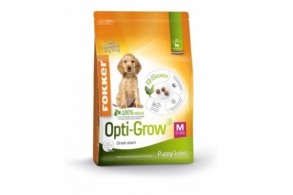 Fokker Opti-Grow M is een high premium hondenvoeding voor jonge honden van middelgrote rassen met een volwassen gewicht van 10 tot 30 kg. De uitgekiende selectie van ingrediënten staat garant voor een gelijkmatige groei. De ontwikkeling van gezonde botten en sterke spieren is de zekerheid voor een energieke en speelse pup. Noorse zalmolie ondersteunt een gezonde huid en een blijvend glanzende vacht. Tot de leeftijd van 12 maanden is dit product de perfecte start voor uw hond. Schakel daarna over op Fokker Nutri-Fit M voor een geweldig leven (zie voedingstabel). Door de hoge smakelijkheid eet uw hond Fokker Opti-Grow M met veel plezier.