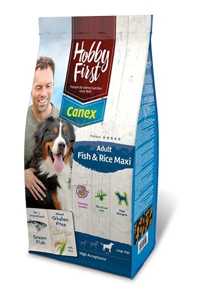 HobbyFirst Canex Adult Fish & Rice Maxi is een zeer licht verteerbare, volledige en uitgebalanceerde voeding voor (volwassen) honden van grote rassen, die aanleg hebben voor