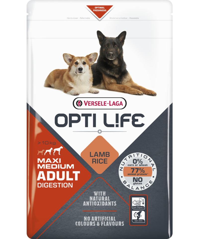 Opti Life Adult Digestion Medium & Maxi is een perfect nutritioneel uitgebalanceerde formule voor middelgrote en grote rassen (>10 kg), op basis van lam & rijst, uitermate geschikt voor jouw hond met een gevoelige spijsvertering.