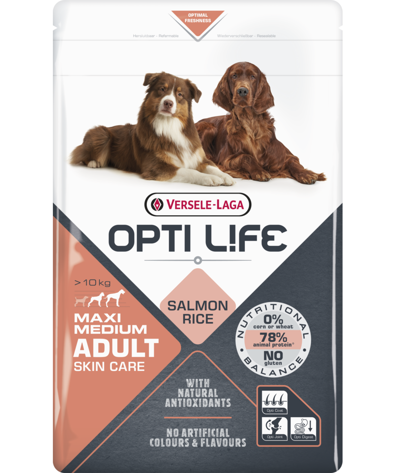 Opti Adult Skin Care Medium & Maxi is een perfect nutritioneel uitgebalanceerde formule voor middelgrote en grote rassen (>10 kg), op basis van zalm & rijst, die de huid en vacht van jouw hond zal doen stralen van gezondheid.