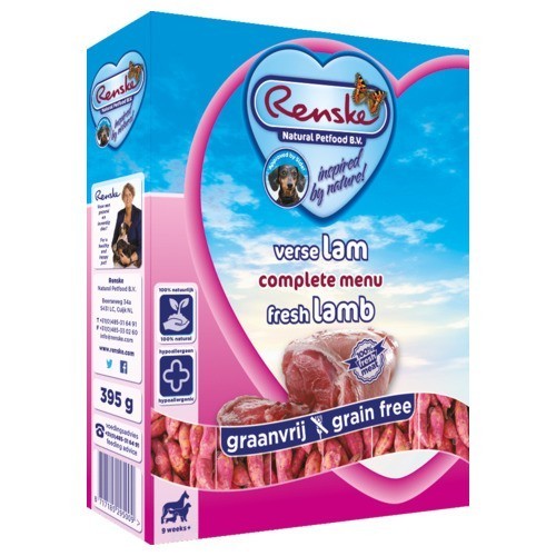 Renske Menu Verse Lam 395gr Graanvrij Dit product is GRAANVRIJ en daarom ook glutenvrij. Deze maaltijd is zeer geschikt wanner de hond een overgevoeligheid heeft voor granen. Zeer geschikt voor honden die slecht reageren op droog- en of blikvoeding of andere soorten van vlees. Prima te variëren met droogvoer. Samenstelling: Lam (80%), zoete aardappel (4%), erwten (1%), wortelen (1%), zeewier (0,45%), prebiotica: FOS (Fructo Oligosacchariden), mineralen, yucca, gemalen smeerwortel, peterselie, rozemarijn en knoflook, glucosamine (0,05%), chondroitine (0,05%). Analyse Ruw eiwit 10%, ruw vet 11%, ruwe as 2%, ruwe celstof 0,4%, calcium 0,36%, fosfor 0,95%, vocht 72%. Aantal calorieën per 100 gram: 125 Kcal. Wij adviseren 1-1,5 pakje Renske Vers per 15 kg lichaamsgewicht hond.