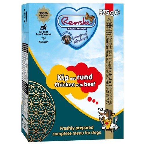Renske Tetrapack Vers Kip/Rund 375gr Renske vers bereide vleesmaaltijd kip met rund is een complete maaltijd voor jonge, volwassen en oude honden van alle rassen vanaf 9 weken. Het product bevat 60% vers bereide kip met rund en is aangevuld met rijst en heerlijke groenten. Met 60% vers bereide kip met rund als hoofdingrediënt Duurzame verpakking Glutenvrij Alle leeftijden (natvoer hond) Verrijkt met duindoorn, gedroogde algen en yucca schidigera De vers bereide maaltijd kip met rund is verrijkt met duindoorn, gedroogde algen en yucca schidigera. Duindoorn zit boordevol natuurlijke antioxidanten, draagt bij aan de ontwikkeling van de hersenen en ondersteunt het herstellende vermogen van de huid en vacht van de hond. Daarnaast bevat deze maaltijd een natuurlijke bron van prebiotica: Xylo-oligosacchariden, welke een gezonde spijsvertering en gezond immuunsysteem ondersteunt. De gedroogde algen zitten boordevol omega-3 en jodium. Verder kan de toevoeging van yucca schidigera ondersteuning geven bij de meest voorkomende klachten waaronder klachten aan het maagdarmkanaal, huid, oren en gewrichten. Als laatste kan Yucca ook de ontlastingsgeur verminderen. Volledig diervoeder 100% natuurlijk met toegevoegde vitamines en mineralen Rijk aan natuurlijke antioxidanten Natuurlijke bron van prebiotica door de toevoeging van Xylo-oligosacchariden Glutenvrij & hypoallergeen Als alternatief voor rauwe voeding Goed te variëren met ons Super Premium Droogvoer Geproduceerd in de Europese Unie Veilig voor mens en dier doordat deze vleesmaaltijd niet meer rauw is In dit product gebruiken we alleen eiwitten afkomstig van kip en rund. Serveer het product op kamertemperatuur. Ongeopend product op een koele, droge plaats bewaren. Geef je niet een heel pakje in één keer? Het pakje is eenvoudig te sluiten en kan gedurende 48 uur in de koelkast bewaard blijven. Samenstelling Kip 50%, rund 10%, gebroken rijst 3,5%, wortelen 3%, erwten 1%, gedroogde algen (fucus vesiculosus) 0,06%, Xylo-oligosacchariden, duindoorn, yucca schidigera extract. 105,6 kcal per 100 gram. Analytische bestanddelen Vocht 75,6%, ruw eiwit 10,7%, ruw vet 5,8%, ruwe as 2,7%, ruwe celstof 1,0%. Toevoegingsmiddelen (per kg): Koper (3b405) 0,75 mg, ijzer (3b101) 2,96 mg, mangaan (3b502) 1,87 mg, zink (3b603) 9,29 mg, jodium (3b201) 0,37 mg. Lees meer...