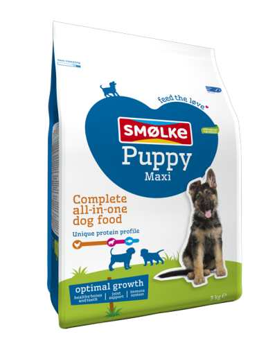 Smølke Puppy Maxi is een complete Alles-in-één hondenvoeding, afgestemd op de behoefte van puppy's tot ongeveer 14-18 maanden en met een volwassen gewicht van boven de 30kg.