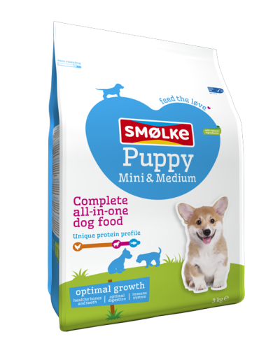 Smølke Puppy Mini-Medium is een complete Alles-in-één hondenvoeding, afgestemd op de behoefte van puppy's tot 10-12 maanden en met een maximaal volwassen gewicht van 30kg.