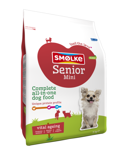 Smølke Senior Mini is een complete Alles-in-één hondenvoeding afgestemd op de behoefte van kleine honden vanaf 8 jaar met een maximaal gewicht van ca. 10kg.