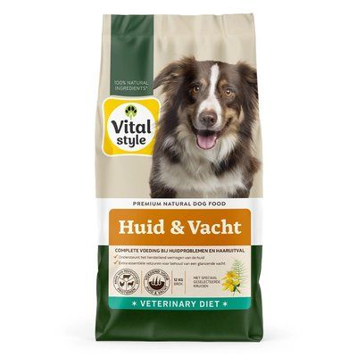 Vitalstyle Huid & Vacht hondenbrokken is 100% natuurlijk. De complete voeding bevat alles wat de hond met huidproblemen/huidaandoeningen of extreem verharen nodig heeft. Huid & Vacht is rijk aan essentiële vetzuren ter ondersteuning van een gezonde huid en glanzende vacht. De dieetvoeding ondersteunt bij huidproblemen en overmatig verharen. De prebiotica, omega 3-6-9 vetzuren en speciale kruiden in Huid & Vacht ondersteunen het behoud van een gezonde spijsvertering, stofwisseling, huid en vacht.