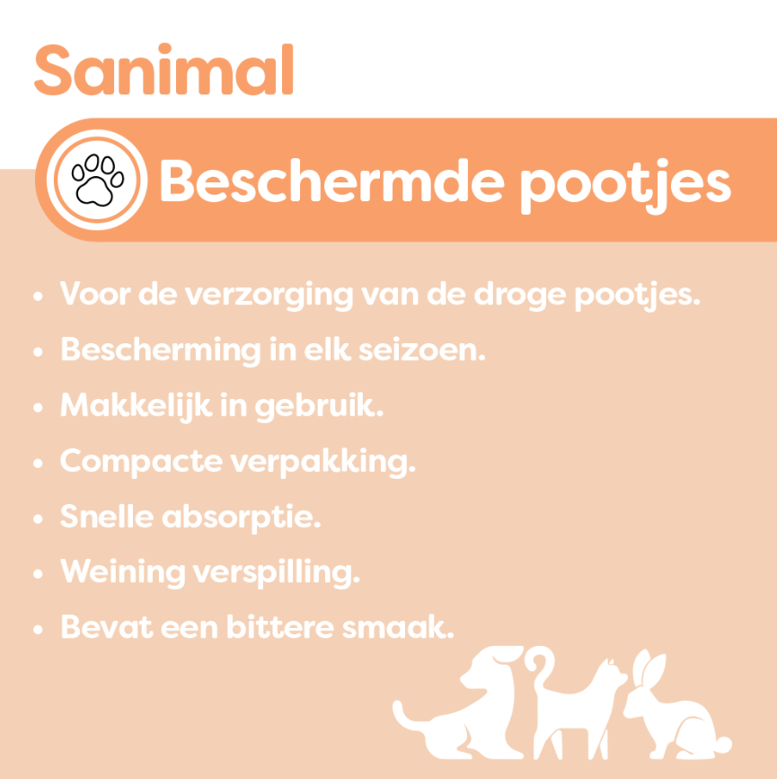 Sanimal Beschermde Pootjes is speciaal ontwikkeld om de pootjes van jouw hond te beschermen en te verzorgen. Deze verzorgende balsem vormt een beschermende laag op de zooltjes, waardoor ze bestand zijn tegen invloeden van buitenaf zoals sneeuw, strooizout, hete oppervlakken of ruwe ondergronden. De natuurlijke ingrediënten in de balsem hydrateren en voeden de huid, waardoor scheurtjes en irritaties worden voorkomen. De formule is zacht en veilig, waardoor het geschikt is voor dagelijks gebruik. Ideaal om de pootjes van jouw hond gezond en soepel te houden, ongeacht de omstandigheden. Beschermt tegen ruwe en extreme omstandigheden Hydrateert en voorkomt droge of gebarsten pootjes