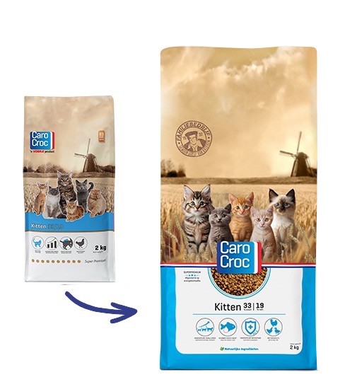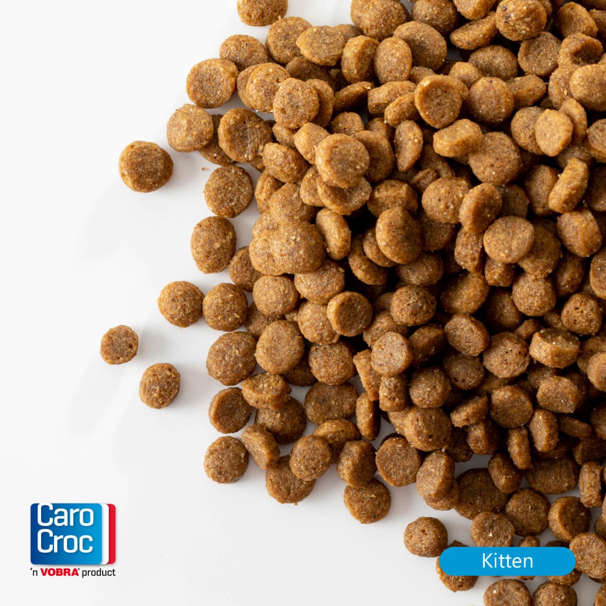 Vanaf de geboorte tot een leeftijd van ongeveer 12 maanden ontwikkelt je kitten zich volop. Het beenderstelsel, verteringsstelsel, de tanden en spieren worden in deze periode gevormd. Daarom is goed kitten voer – juist in deze fase – van cruciaal belang. Door alle ontwikkelingen heeft je kitten een hogere energiebehoefte. Om in deze behoefte te voorzien, bevat ons kittenvoer een hoger eiwit- en vetgehalte (33% eiwit en 19% vet). Dit is hoger dan bijvoorbeeld onze CaroCroc Indoor brokken (29% eiwit en 14% vet) voor volwassen katten. We noemen dit ook wel voeren naar energiebehoefte.