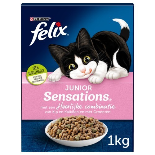 FELIX® Junior Sensations maaltijden zien, ruiken en smaken natuurlijk heerlijk voor jouw kitten. Iedere kleurrijke maaltijd is speciaal ontwikkeld voor kittens van 6 - 52 weken en boordevol heerlijke, knapperige vormen en sensationele smaken. Dat is niet alles! Met FELIX® Junior Sensations weet je dat je kitten alle smakelijke goedheid binnenkrijgt die hij nodig heeft voor een mooi begin van een sensationeel leven vol kattenkwaad! Wist je dat? FELIX® Junior Sensations is ook geschikt voor drachtige en zogende katten. FELIX® Junior Sensations is 100% volledig en gebalanceerd.