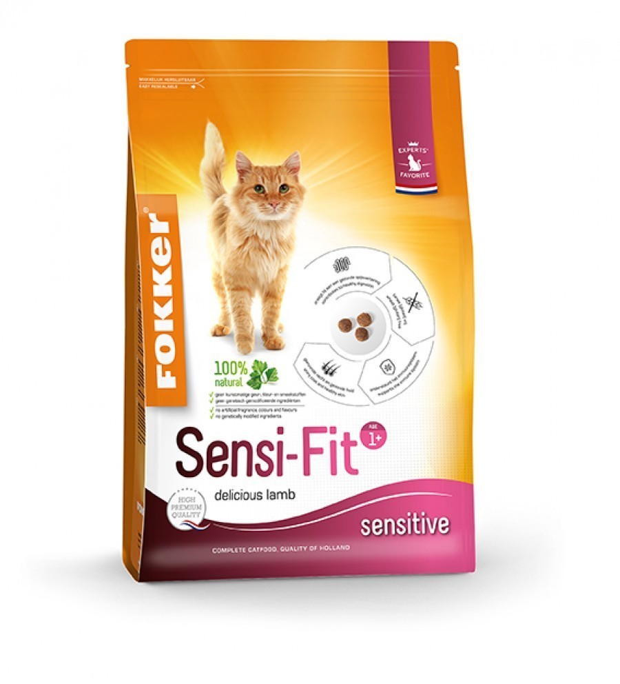 Fokker Sensi-Fit is een volledige premium kattenvoeding voor volwassen katten en is speciaal ontwikkeld voor gevoelige katten. Fokker Sensi-Fit helpt huidaandoeningen en verteringsproblemen als diarree en braken te voorkomen. Ondersteunt het goed functioneren van de urinewegen (PH 6 – PH 6,5). Fokker Sensi-Fit is erg smakelijk en wordt daarom door alle katten graag gegeten.