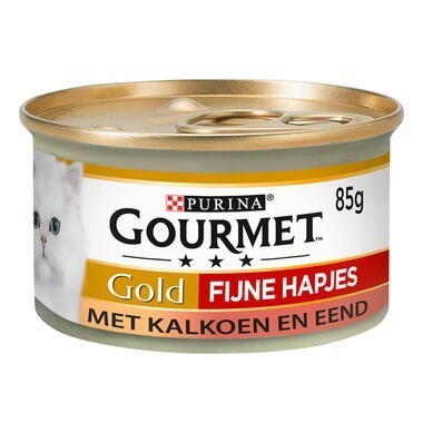 GOURMET™ Gold Fijne Hapjes in Saus kattenvoer is een heerlijk recept om haar verfijnde smaak dagelijks te verwennen met een andere smaakbeleving. Fijne stukjes met kalkoen en eend, zachtjes gekookt tot in de perfectie en ondergedompeld in een smakelijke saus om jouw kat te plezieren met een geweldige en rijke smaak. Fijne Hapjes van GOURMET™ Gold, verleidt je kat met een sappige verwenning! Geen toegevoegde kunstmatige kleurstoffen, conserveermiddelen en smaakstoffen.