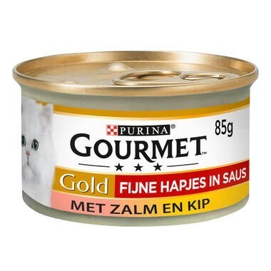 GOURMET™ Gold Fijne Hapjes in Saus kattenvoer is een heerlijk recept om haar verfijnde smaak dagelijks te verwennen met een andere smaakbeleving. Fijne stukjes met kip en zalm, zachtjes gekookt tot in de perfectie en ondergedompeld in een smakelijke saus om jouw kat te plezieren met een geweldige en rijke smaak. Fijne Hapjes van GOURMET™ Gold, verleidt je kat met een sappige verwenning! Geen toegevoegde kunstmatige kleurstoffen, conserveermiddelen en smaakstoffen.