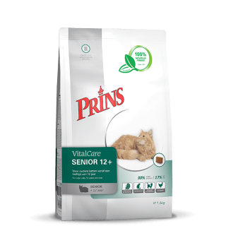 VitalCare Senior 12+ bevat een verhoogd energiegehalte wat bijdraagt aan het behoud van een gezond gewicht. Oudere katten kunnen te maken hebben met een verminderde eetlust. De zorgvuldig geselecteerde ingrediënten zorgen voor een smakelijk voeding en stimuleren de eetlust van de oudere kat. Daarnaast helpt een kleinere brokvorm de oudere kat gemakkelijk de voeding op te nemen en te kauwen. Ook bevat de voeding ingrediënten, zoals betaglucanen en zalmolie, om de gewrichten van de oudere kat te ondersteunen, en extra vitamine E om het ontstaan van ouderdomsziekten te vertragen.