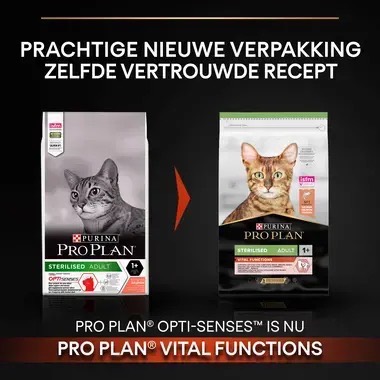 Een volledige en droge diervoeder wetenschappelijk samengesteld voor gesteriliseerde of gecastreerde volwassen katten. PRO PLAN® Sterilised kattenvoer met OPTISENSES™ bevat alle voedingsstoffen die jouw kat nodig heeft voor de dagelijkse vitaliteit en gezondheid op de lange termijn. Het bevat ook OPTISENSES™, een voedingsmix die wetenschappelijk bewezen het brein voedt om de vitale zintuigen te ondersteunen. De samenstelling is deskundig uitgebalanceerd om gesteriliseerde/gecastreerde katten te helpen om gezond te blijven tijdens hun volwassen jaren. Het eiwitgehalte, vetgehalte en koolhydraatgehalte is speciaal aangepast om gesteriliseerde/gecastreerde katten te helpen om het ideale lichaamsgewicht te behouden. De knapperige brokjes textuur heeft bewezen de tanden te beschermen tegen de opbouw van tandplak en tandsteen.