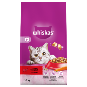 WHISKAS® 1+ droge brokjes rund is volledige en gebalanceerde voeding met een optimale balans van vitaminen en mineralen, om te helpen de best mogelijke verzorging te geven aan uw volwassen kat.