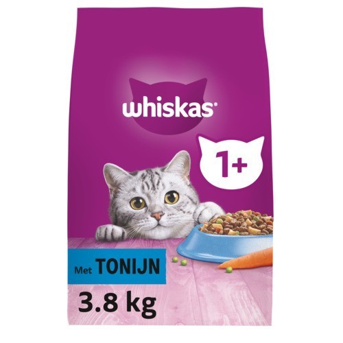 WHISKAS® 1+ droge brokjes tonijn is volledige en gebalanceerde voeding met een optimale balans van vitaminen en mineralen, om te helpen de best mogelijke verzorging te geven aan uw volwassen kat.