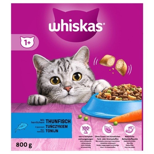 WHISKAS® 1+ droge brokjes tonijn is volledige en gebalanceerde voeding met een optimale balans van vitaminen en mineralen, om te helpen de best mogelijke verzorging te geven aan uw volwassen kat.