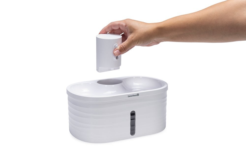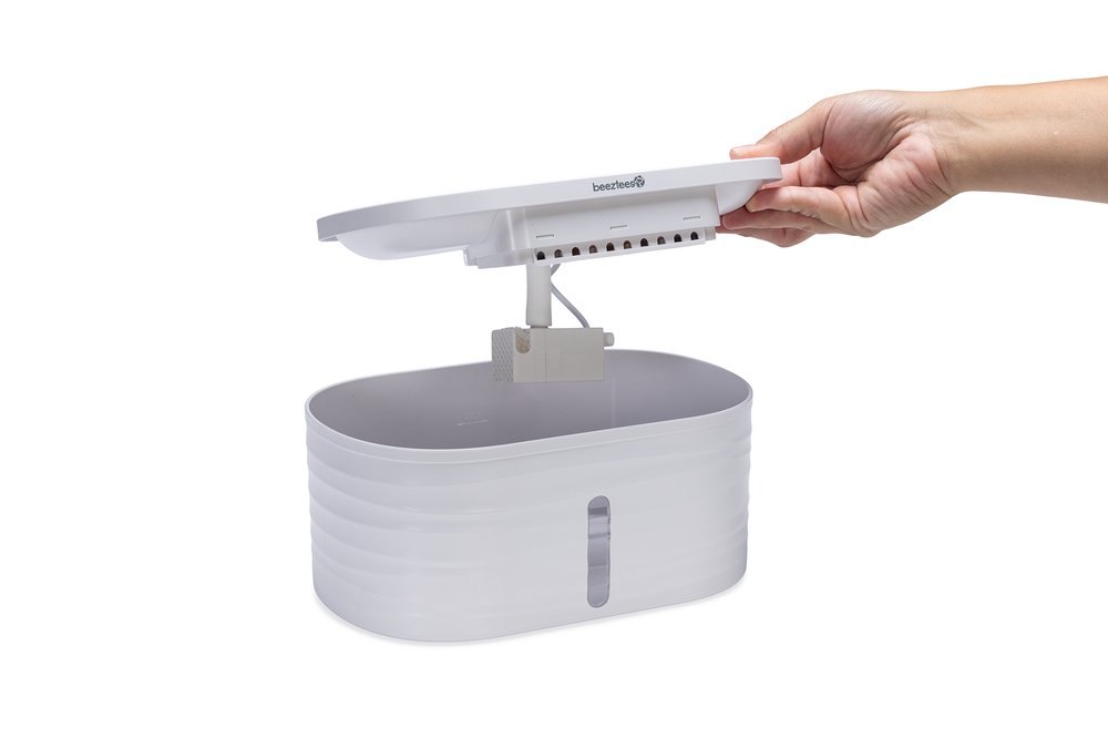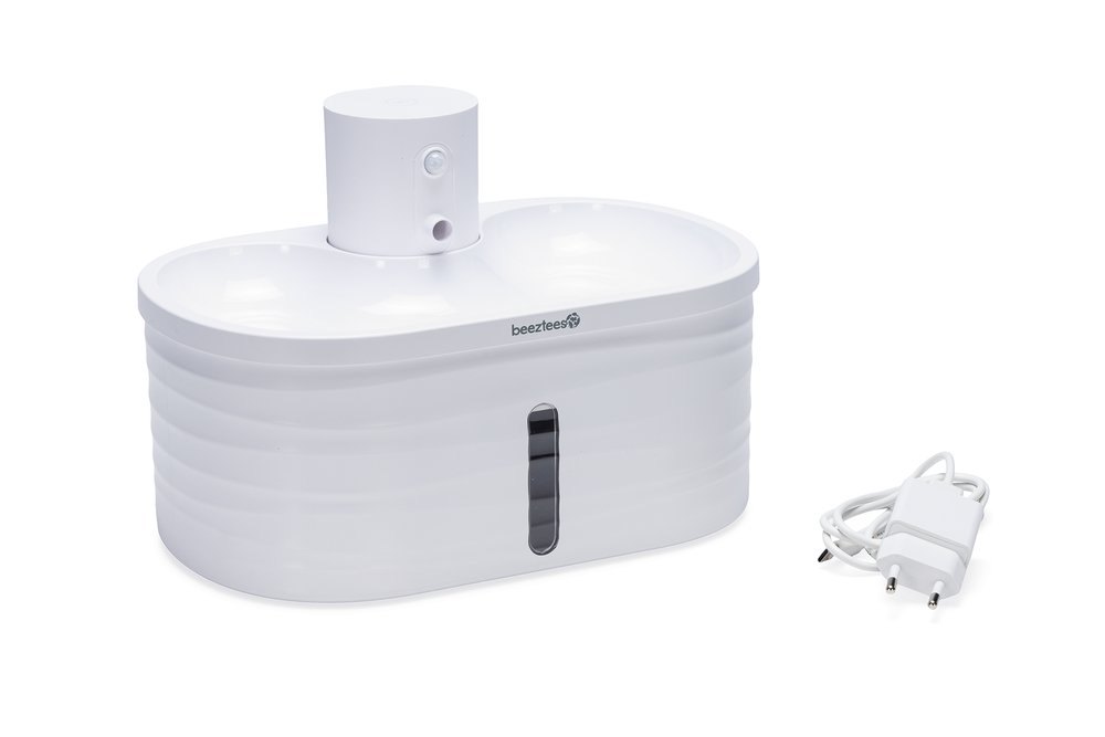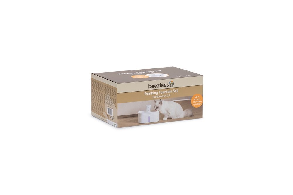 Met de Beeztees Sef Drinkfontein heeft je kat altijd toegang tot vers water. De fontein heeft een capaciteit van 2,5 liter en werkt tot wel 80 dagen op een volle batterij. Het transparante venster laat je zien wanneer het tijd is om water bij te vullen. Deze drinkfontein is eenvoudig in elkaar en uit elkaar te halen, zodat je hem eenvoudig kunt schoonmaken. Je kunt kiezen uit verschillende watermodi: timer, interval of continue stroming. En mocht er een stroomuitval zijn, dan blijft er altijd 200 ml water in de kom beschikbaar. De drievoudige filtratie zorgt voor lekker schoon water, en de speciale wateruitlaat maakt minder geluid, zodat je kat rustig kan drinken. De slimme systemen geven je een seintje bij een laag batterij- of waterniveau en stoppen de pomp als er geen water meer is.