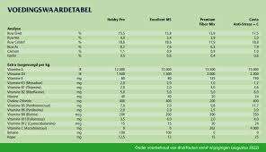 Samenstelling: tarwegries, zonnebloemzaadschroot, luzerne, soyahullen, palmpitschilfers, haverdoppen, bietenpulp, rietmelasse, gerst, calciumcarbonaat, lignocellulose, natriumchloride, plantaardige olien en vetten.