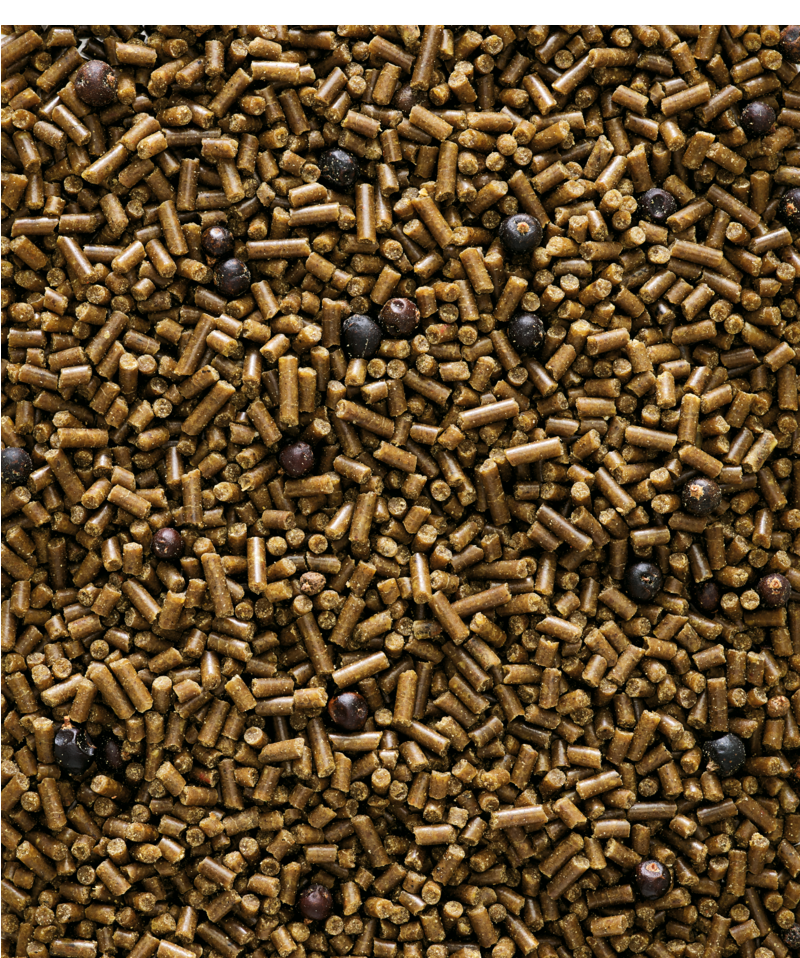 granen, plantaardige eiwitextracten, plantaardige bijproducten, oliën en vetten, mineralen, vruchten (jeneverbes 7,5%*), suiker