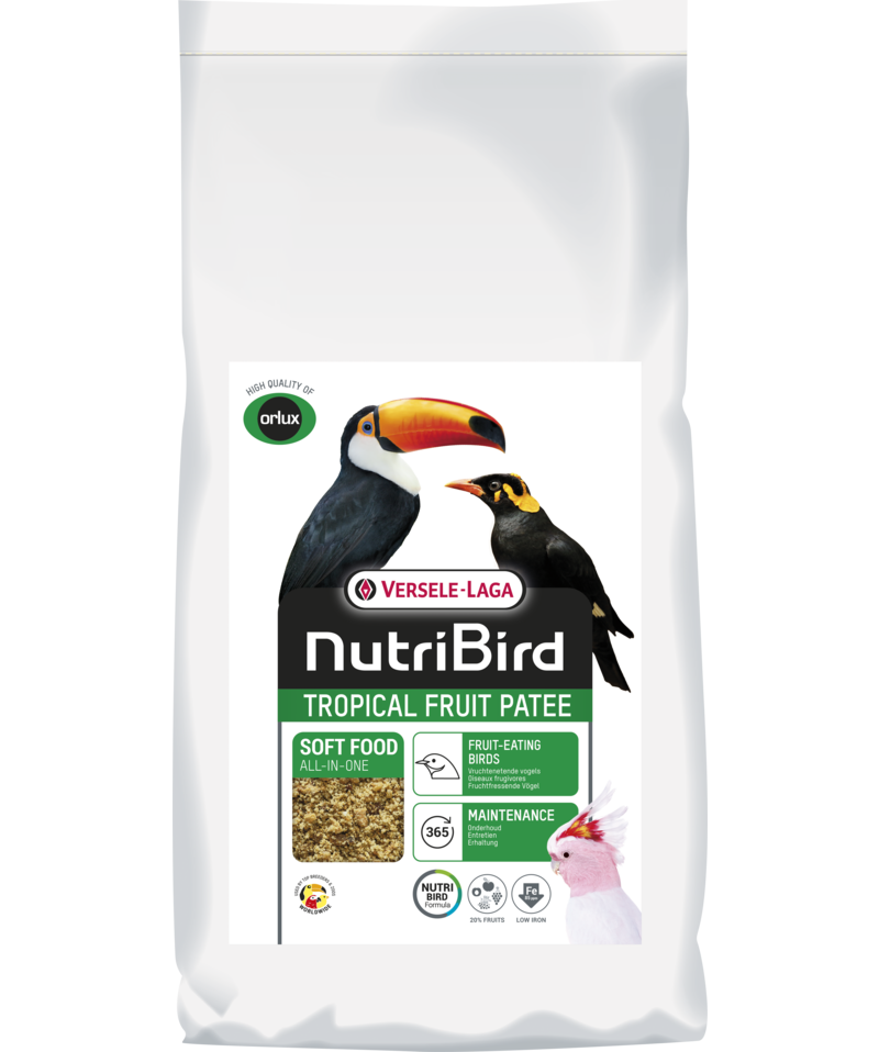Nutribird Tropical Fruitpatee -vruchtenpatee zak 25 kilo Volledig voeder voor alle vruchtenetende vogels Uitgebalanceerde vruchtenpatée met alle voedingsstoffen die jouw vogels nodig hebben. Met 25% gedroogde vruchten: abrikozen, ananas, papaja, appels, lijsterbessen en rozijnen. Grovere structuur voor een betere opname. Met Spirulina. OPTI TASTE Verzekert een goede opname, ideaal om supplementen of medicatie aan toe te voegen. OPTI FEATHER Bevat alle voedingsstoffen voor een prachtig verenkleed. OPTI CALCIUM De optimale calcium-fosforverhouding voor een gezond beendergestel. SAMENSTELLING bakkerijproducten, vruchten (20%), plantaardige eiwitextracten, oliën en vetten, honing, suikers, mineralen, algen (spirulina), FOS, MOS ANALYTISCHE BESTANDDELEN eiwit 15%, vetgehalte 15%, ruwe celstof 2%, ruwe as 5,5%, calcium 1,4%, fosfor 0,6%, methionine 0,25%, lysine 0,9%, threonine 0,55%, tryptofaan 0,15%, cystine 0,25% TOEVOEGINGSMIDDELEN/KG NUTRITIONELE TOEVOEGINGSMIDDELEN vitamine A 8400 IE, vitamine D3 1000 IE, ß-caroteen 4,65 mg, vitamine E 185 mg, vitamine B1 3,85 mg, vitamine B2 8,6 mg, calcium-D-pantothenaat 10,5 mg, vitamine B6 3,2 mg, vitamine B12 0,02 mg, vitamine C 40 mg, niacine 35 mg, foliumzuur 0,65 mg, biotine 0,11 mg, cholinechloride 1200 mg, 3b202 (jodium) 2 mg, 3b405 (koper) 10 mg, 3b503 (mangaan) 100 mg, 3b605 (zink) 97 mg, 3b802 (selenium) 0,2 mg GEBRUIKSAANWIJZING Gebruiksklaar. Het hele jaar door naar believen verstrekken. Regelmatig verversen. TIPS Aanvullen met verse vruchten. Ook een ideale bijvoeding voor alle soorten grote parkieten, papegaaien, kaketoes, ara's, …