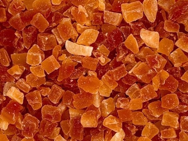 Gedroogde blokjes papaya, geschikt als aanvulling op het dagelijkse voer of lekker als extraatje.