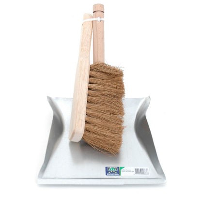 set van zinken blik met houten steel en handveger hout met kokos natuurvezel met trekbandje aan het blik bevestigd