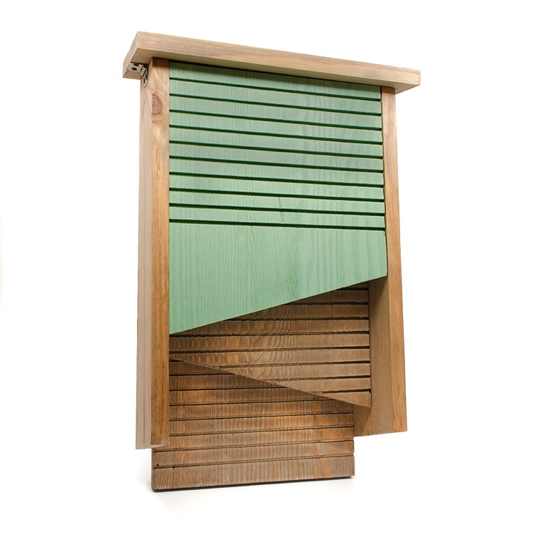 Deze vleermuiskast heeft twee schuine weggesneden verticale kamers met stijlgroeven waardoor de vleermuis makkelijk kan klimmen in de gewenste kamer.